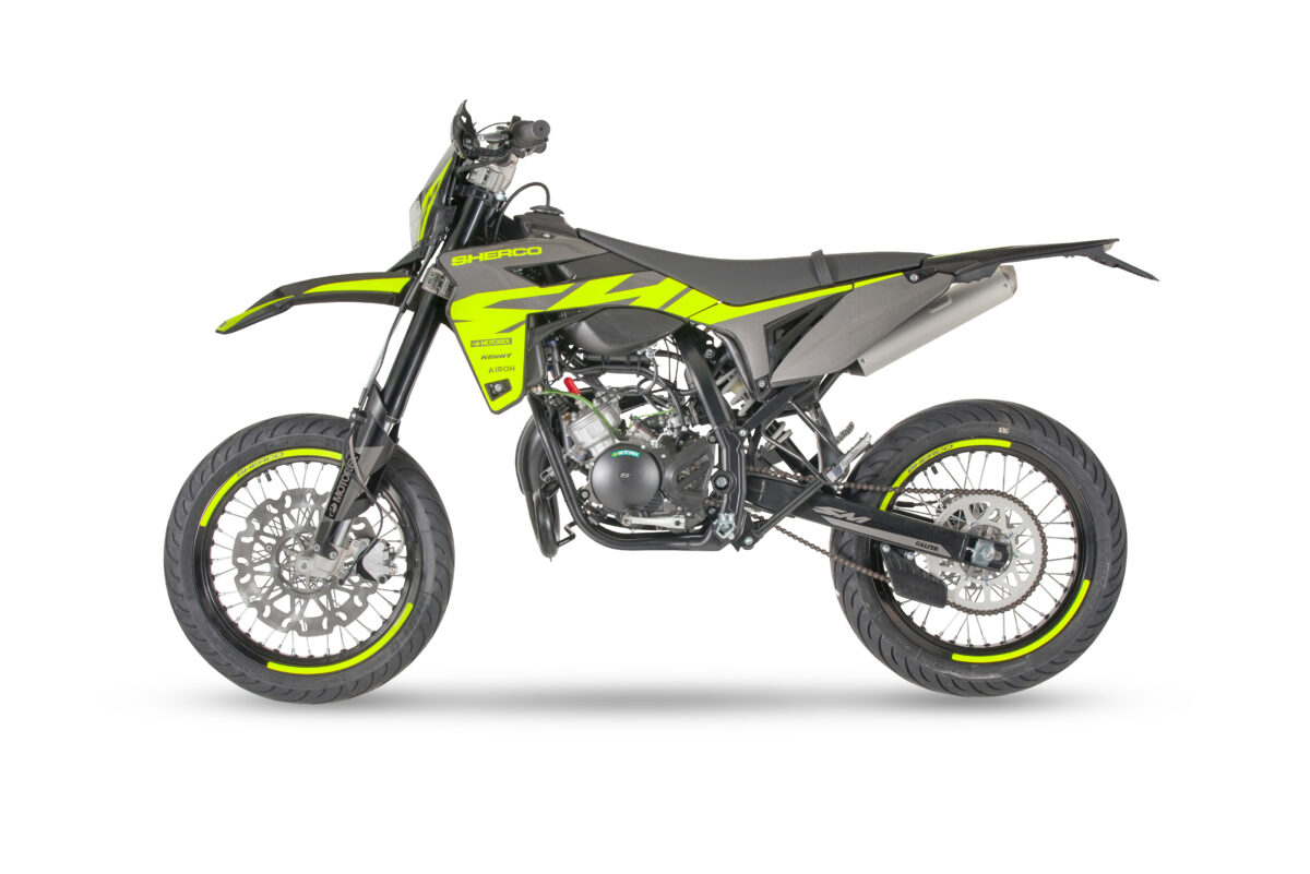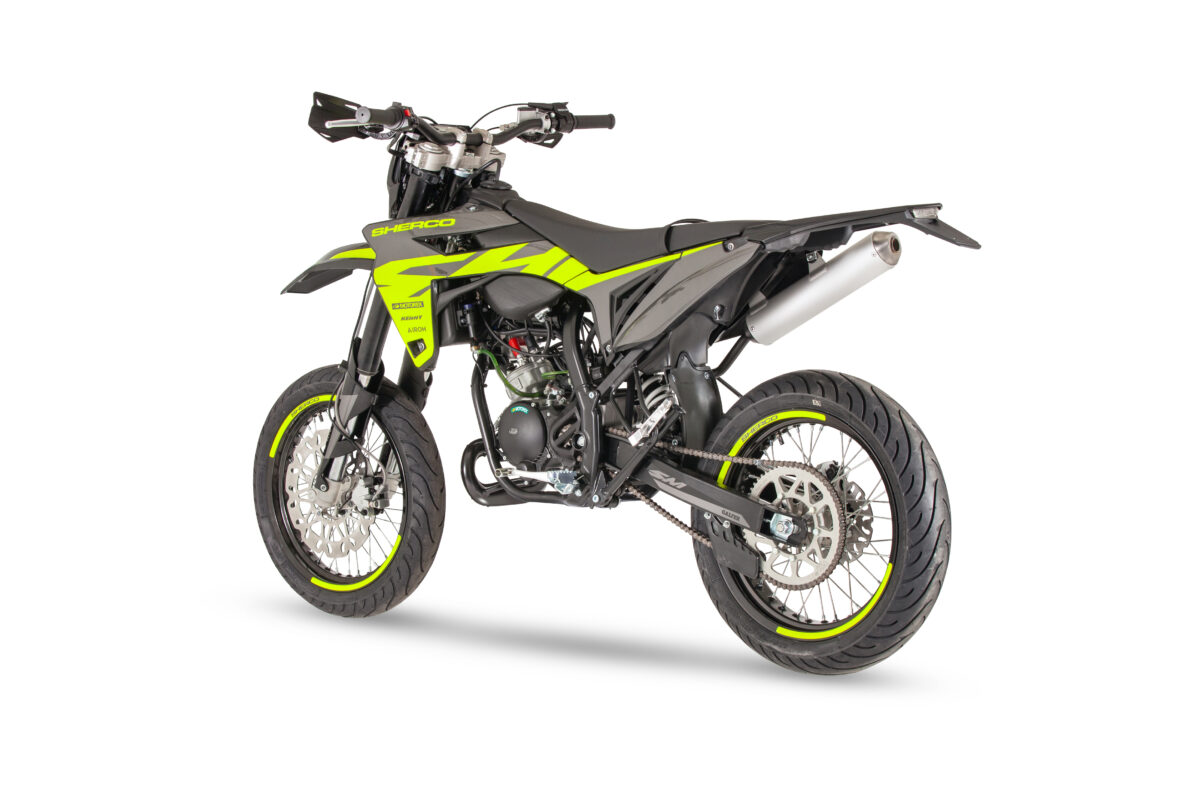 Er is ook een goedkopere uitvoering van de Sherco 50SM Silver RS zonder spaakwielen en upside down voorvork!