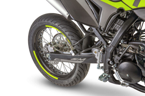 In tegenstelling tot de SM Silver black R is de Sherco SM Silver black RS 50cc voorzien van een Upside-down vork en spaakwielen!